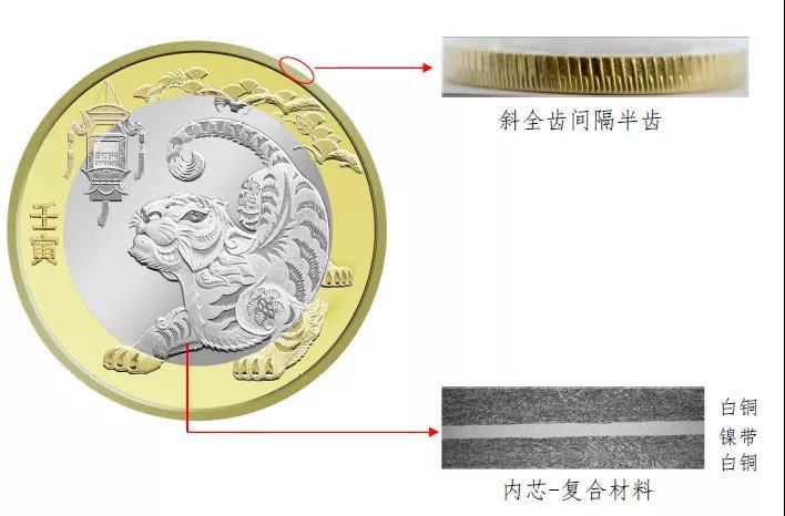硬币外环为黄铜合金,内芯为具有独特机读性能的镍带复合白铜材料。