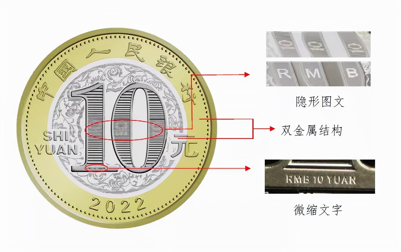 在硬币正面面额数字“10”的底端,可观察到“RMB 10 YUAN”的微缩文字。